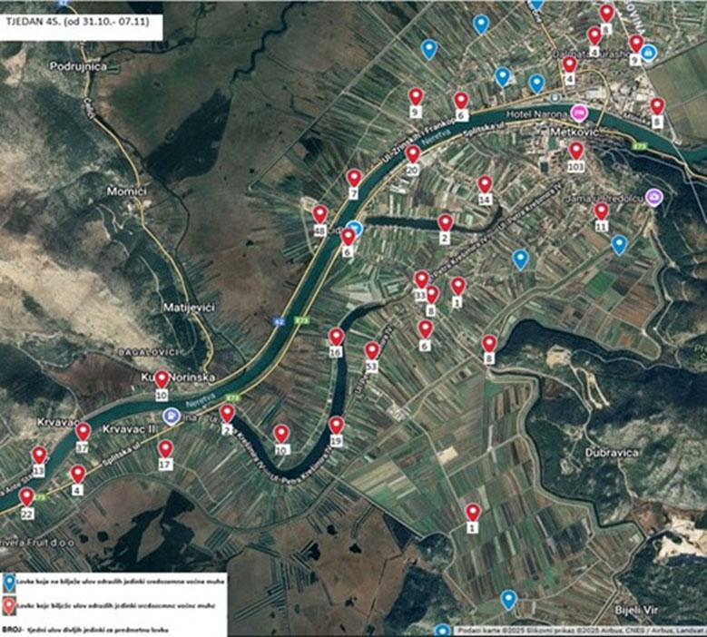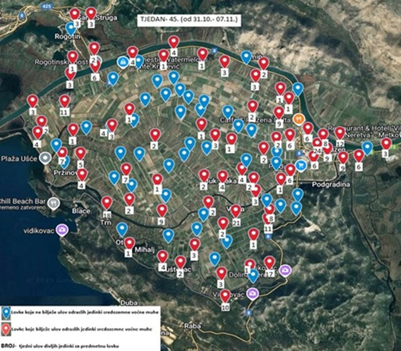 Prema dostupnim informacija iz HAPIHA –CZB (sukladno Akcijskom planu poduzimanju mjera sprječavanja širenja i suzbijanja sredozemne voćne muhe (Ceratitis capitata) informiramo sve poljoprivredne proizvođače o ulovu sredozemne voćne za 45. tjedan (31.10.- 7.11.) na cjelokupnom područje doline Neretve.
